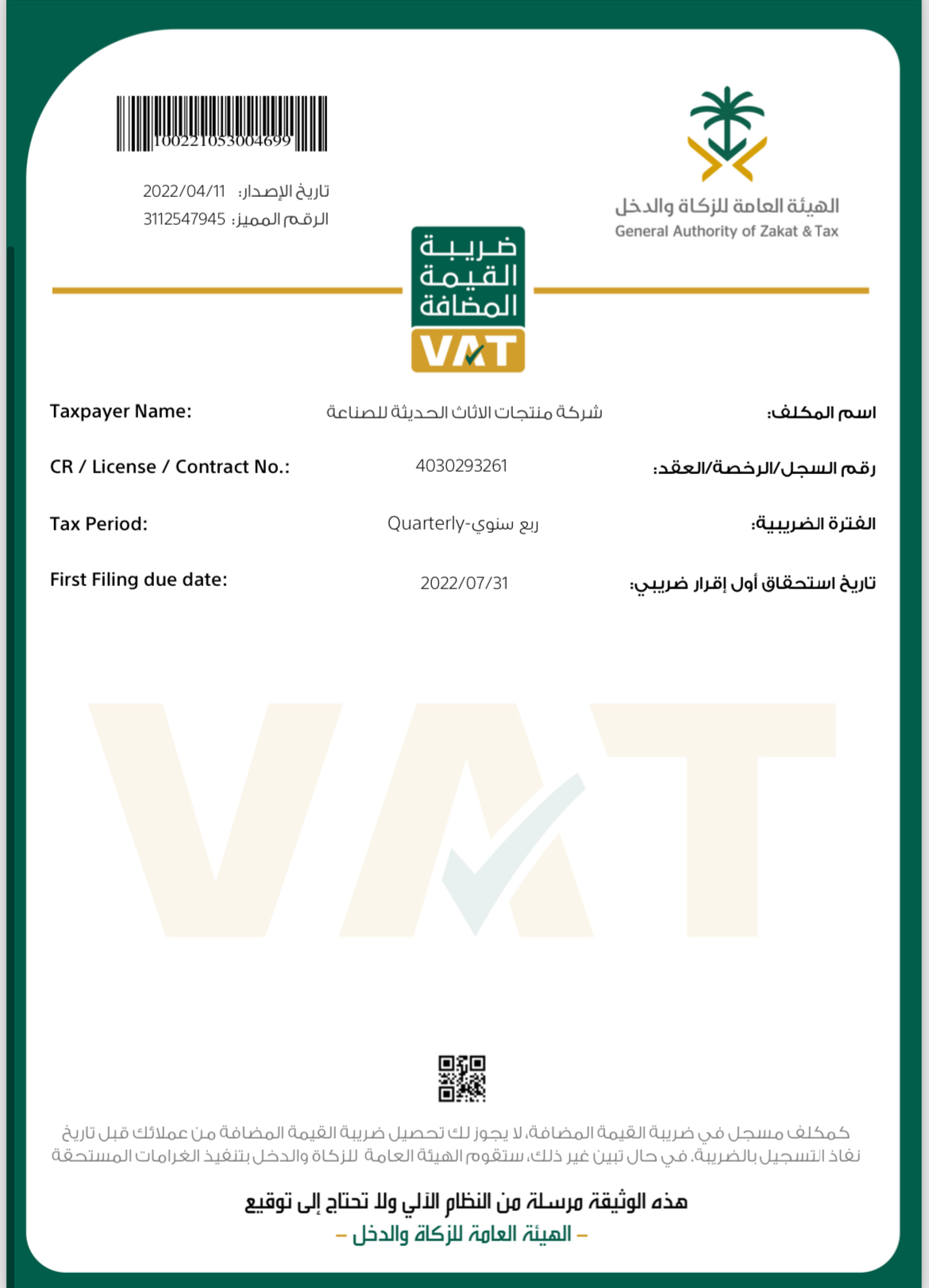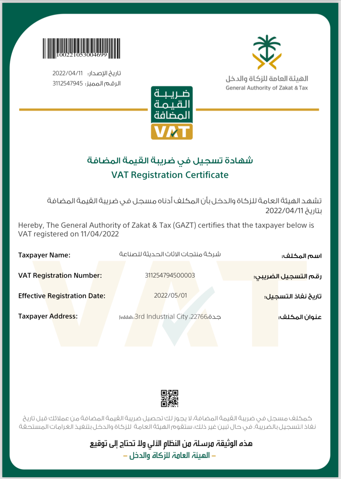شهادة ضريبة القيمة المضافة